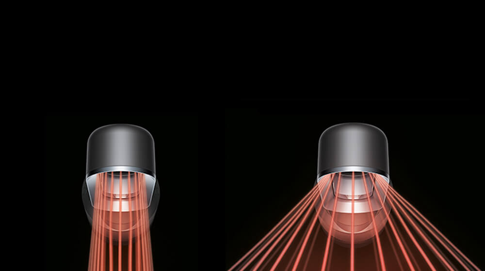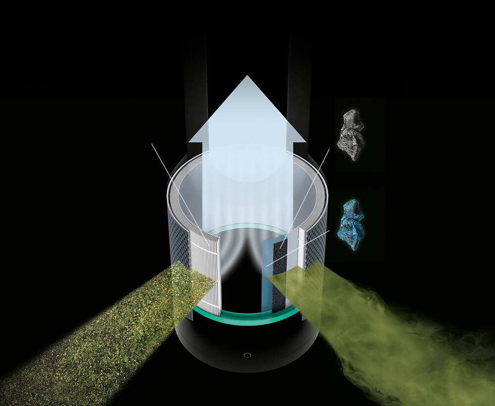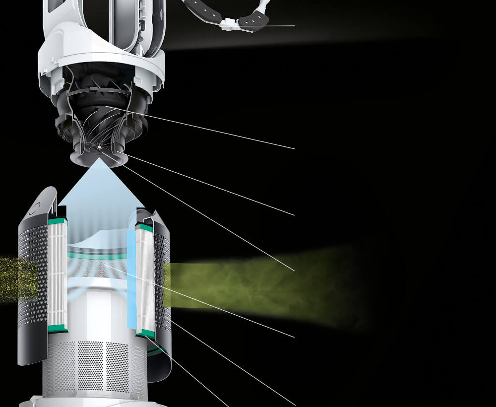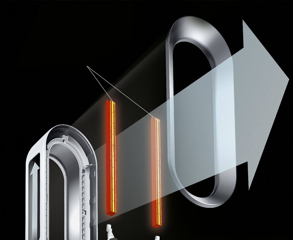 Pročišťovaný vzduch prochází 2,5mm štěrbinou přes šikmou plochu ve tvaru křídla. Proud vzduchu pak protéká přes směrovou plochu, která zajišťuje projekci silného proudu vzduchu směrem k uživateli.